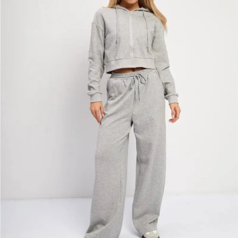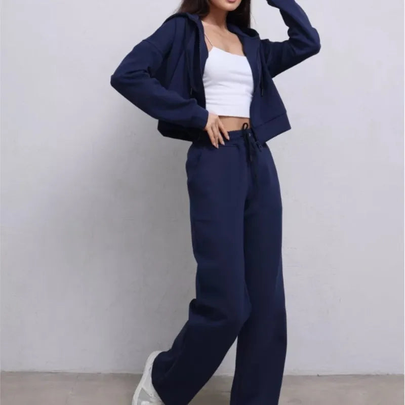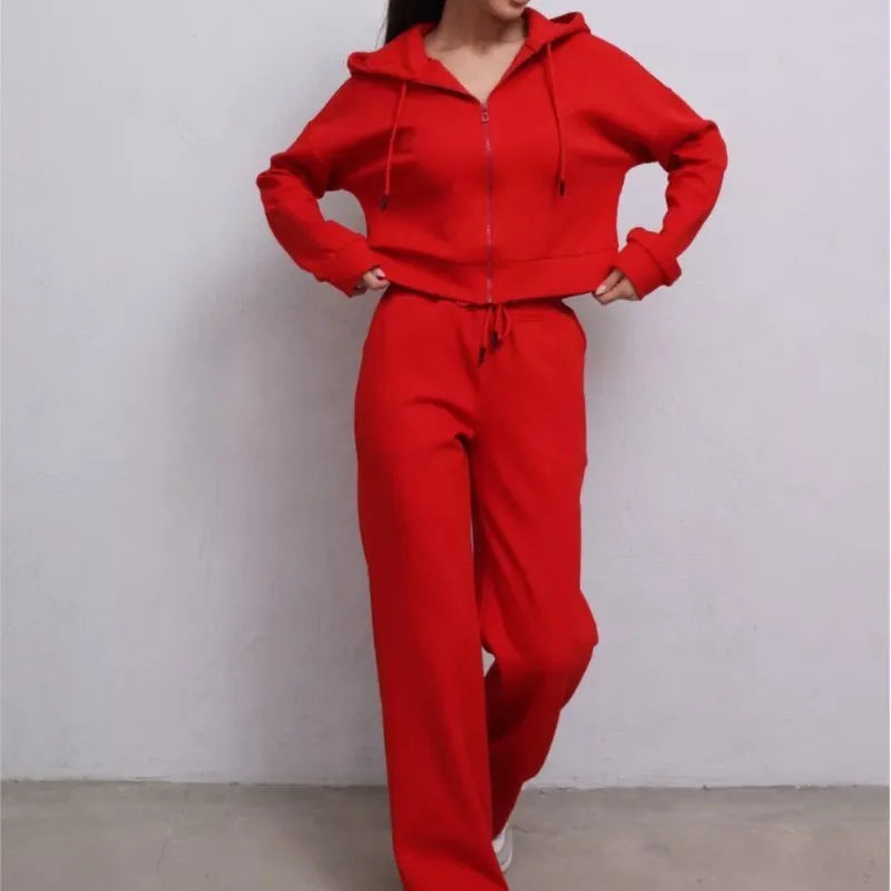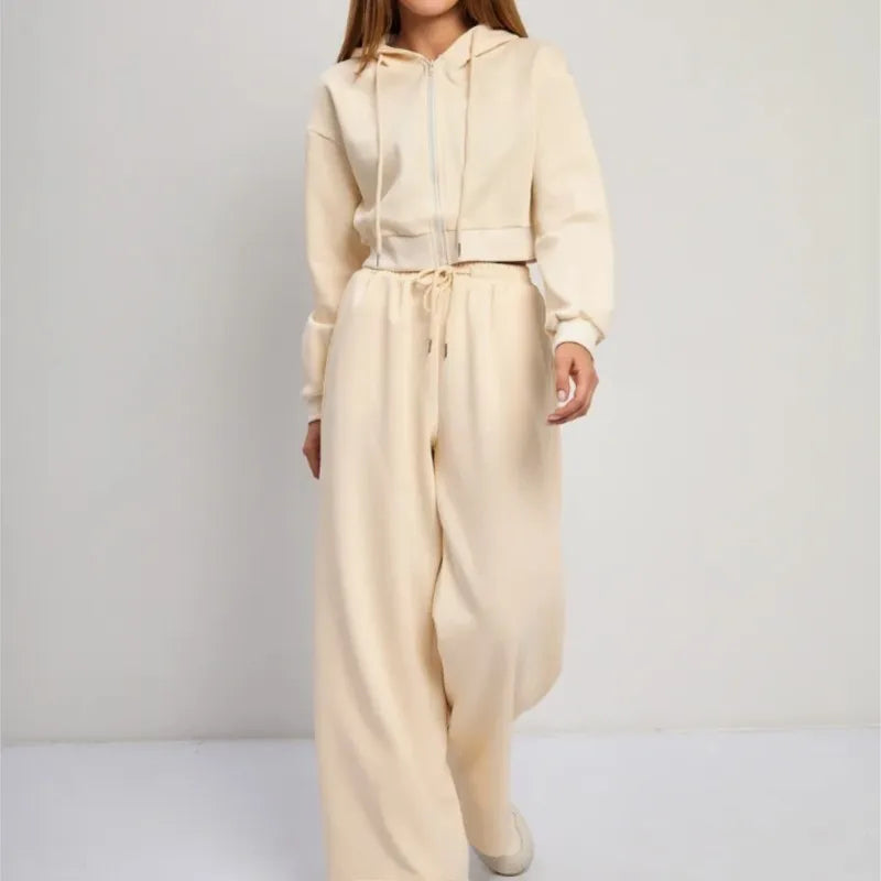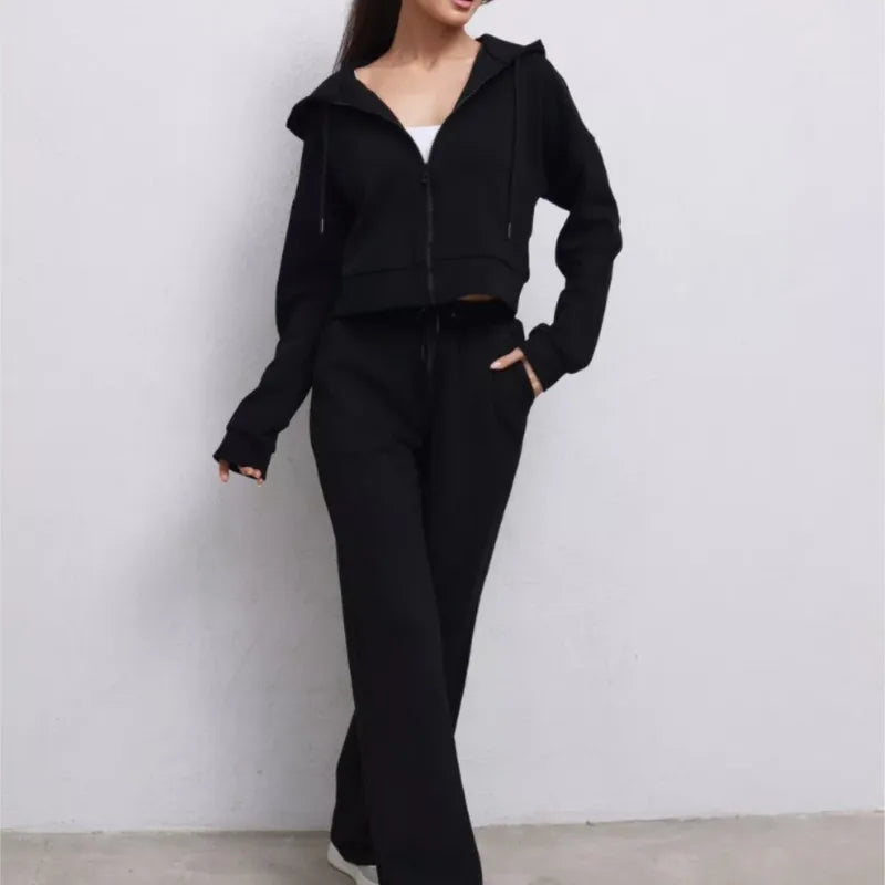 2025 Autumn Casual Solid Color Women's Sports Suits Fashion Zipper Cardigan Loose Hooded Sweatshirt Wide-leg Pants Two-piece Set
