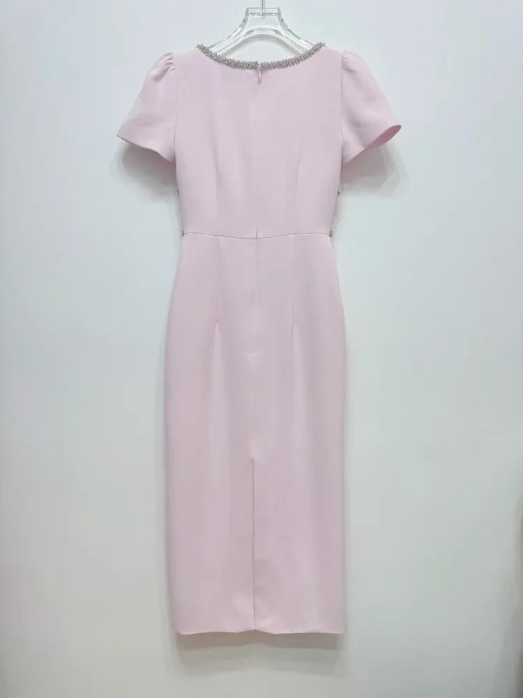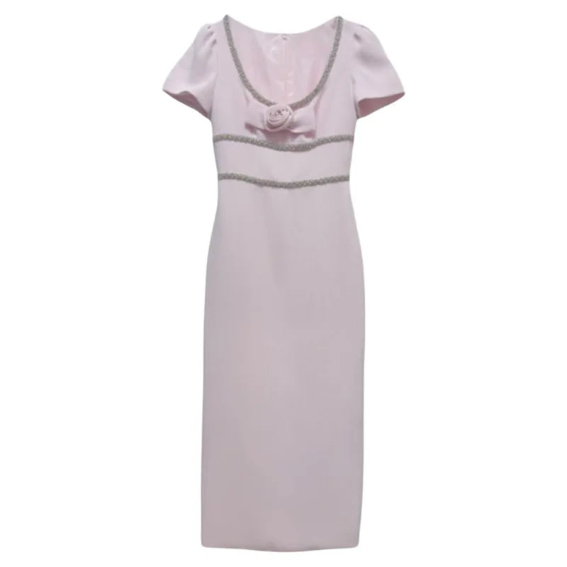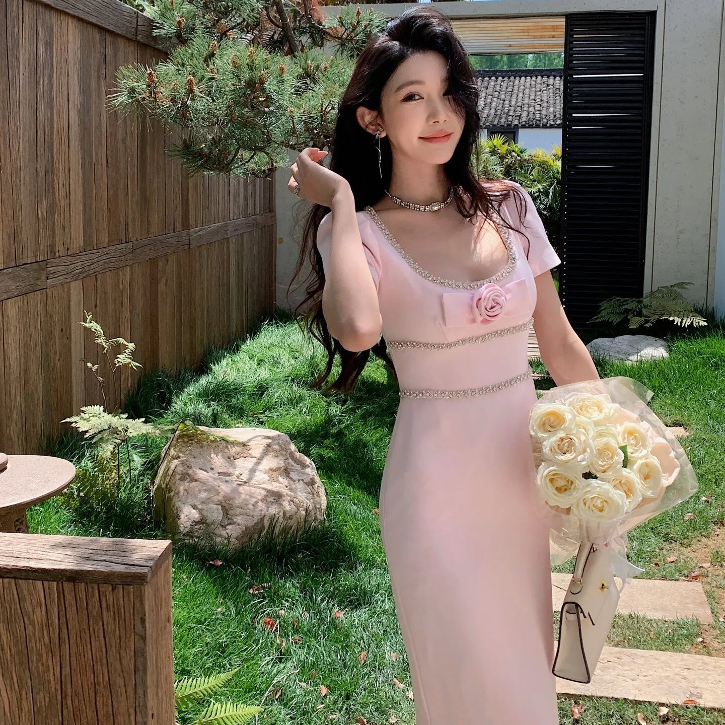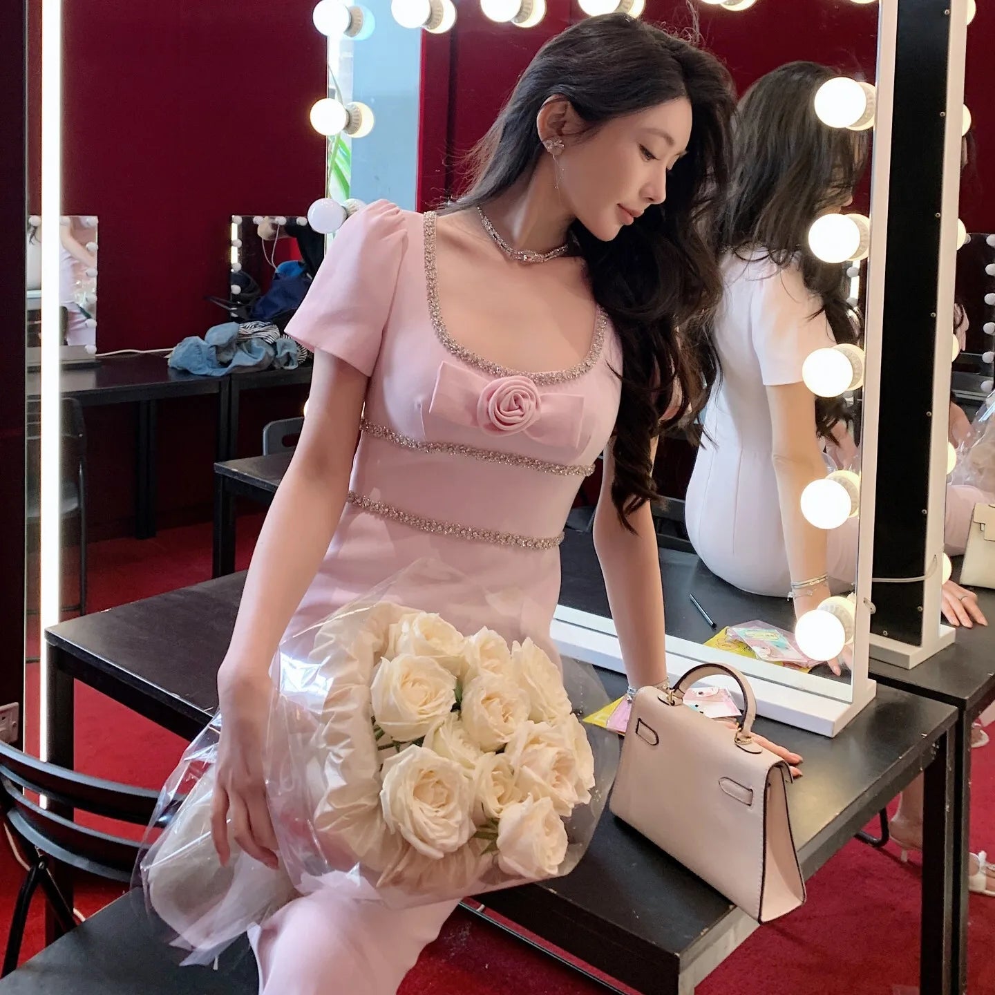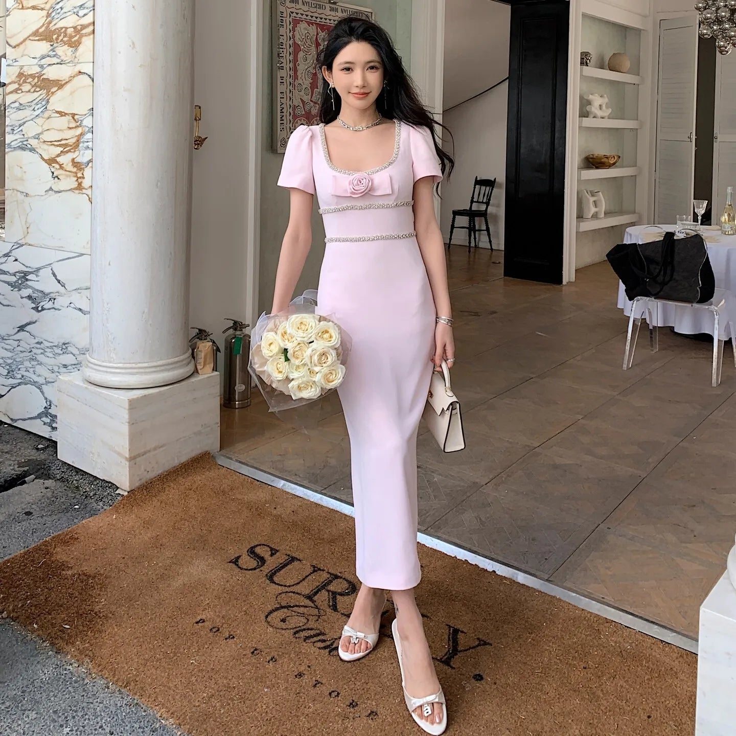 Crystal Formal Luxury Evening Dress Women Brand Designer Summer Short Sleeve 3D Flower Bead Chain Pencil Long Dresses Party