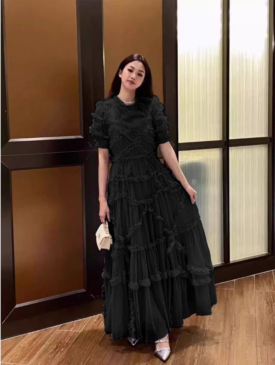 Quality Vintage Summer Holiday Layers Ruffle Cake tulle Long Dress Women Blue Dots Elegant Party Evening Vestidos
