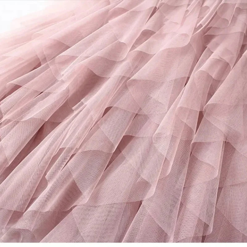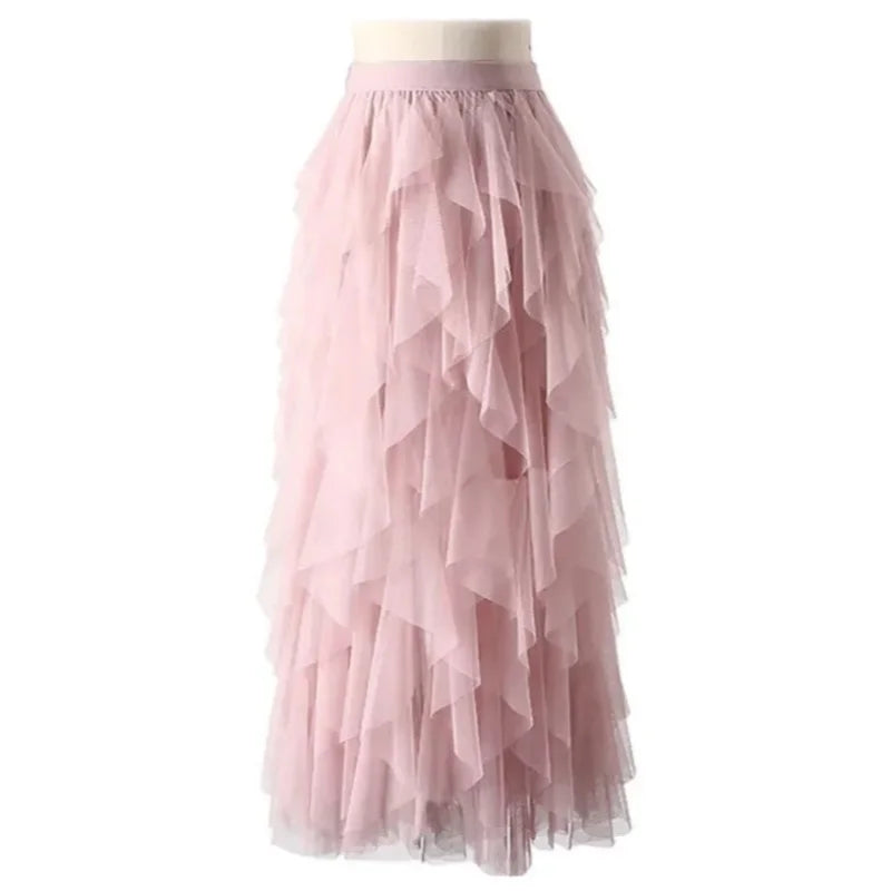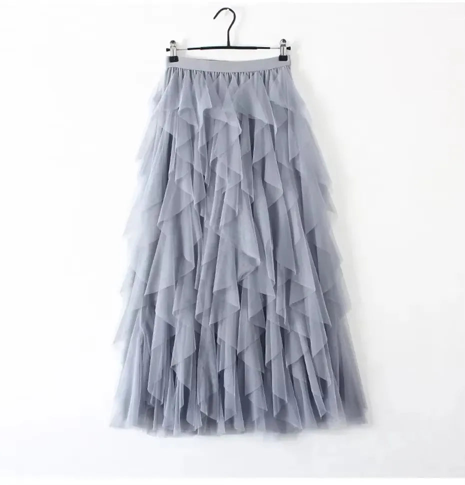 Womens Elastic High Waist Tulle Mesh Irregular Tutu Skirt gauze skirt spring and summer new pleated A-line skirt in the long hi